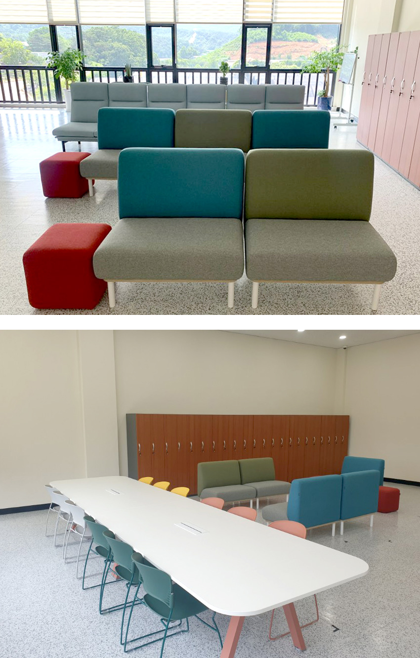 600G 모듈소파(GN,BU)+ 사각스툴(RE)+ HUB-T_4800테이블(덕트형/SW)+Seminar 체어